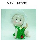 Cute and adorable Coin Bank depicting a Flower Baby for May babies. Lucy’s Birth Flower is Lily of the Valley and the Flower Traits are: Sweetness, Happiness, Good Fortune. In bright and beautiful colors, the May Baby Coin Bank measures about 7 inches tall and is made of resin. Fine detail and delightful design, Lucy would make a great gift for any May baby.
